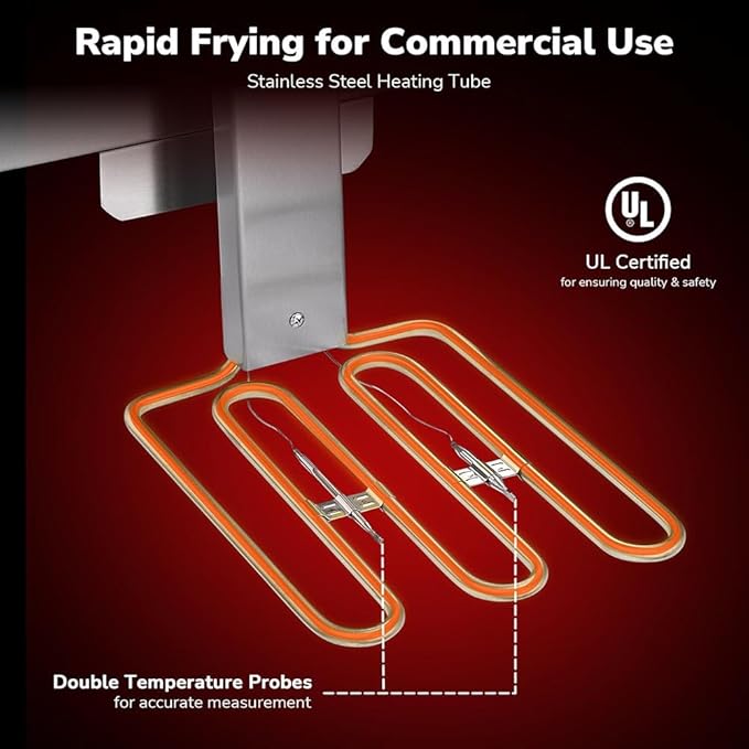- Adjustable Temperature Control: Each head has independent temperature control switches that allow you to adjust from 122℉ to 390℉ (50℃-200℃) with a overheat sensor that cuts off the power if the oil reaches 465F degrees, you can set the optimal temperature depending on what you cook. An installed guard plate effectively balances oil temperature and ensures food is fried evenly