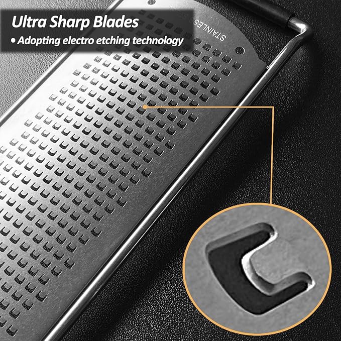 - EFFORTLESS & SAFE - The blade of this cheese grater is designed with special square blade and processed with photo-etching technology. Tough body with large size non-slip handle makes it more safe and effortless while grating. It is the better choice of grater and zester for kitchen tools