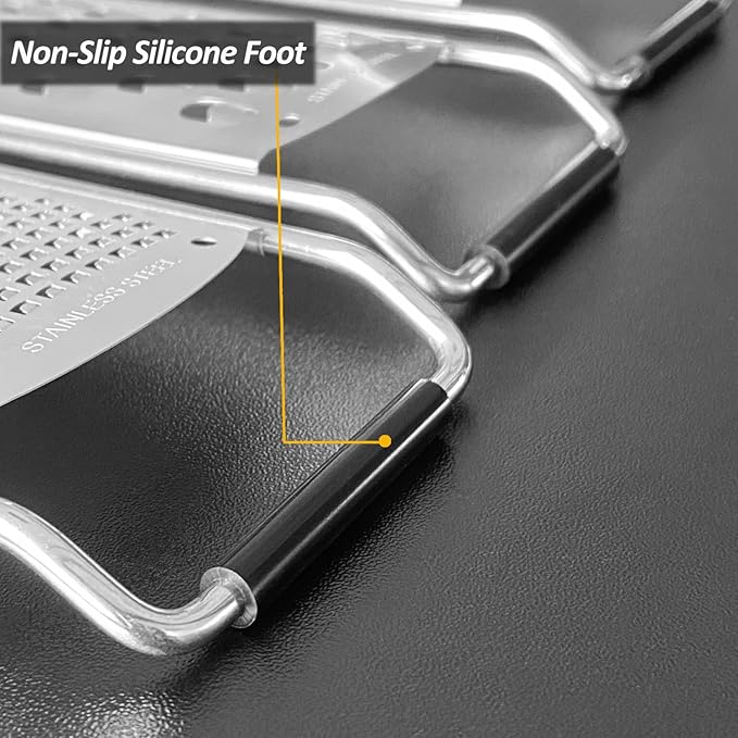 - EFFORTLESS & SAFE - The blade of this cheese grater is designed with special square blade and processed with photo-etching technology. Tough body with large size non-slip handle makes it more safe and effortless while grating. It is the better choice of grater and zester for kitchen tools