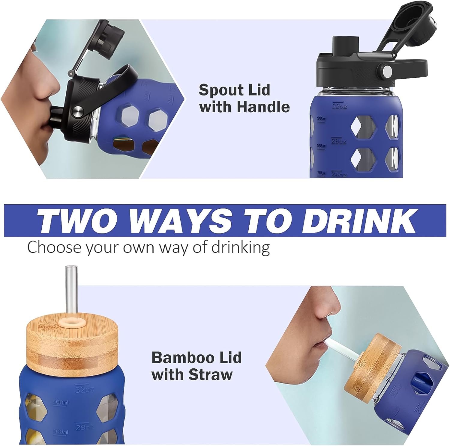MUKOKO Glass Water Bottles, 32oz Glass Tumbler with Straw, Drinking Bottles with 2 Lids-Handle Spout Lid&Bamboo Straw Lid, Motivational Water Bottle with Time Marker and Silicone Sleeve, 1 Pack-Blue
