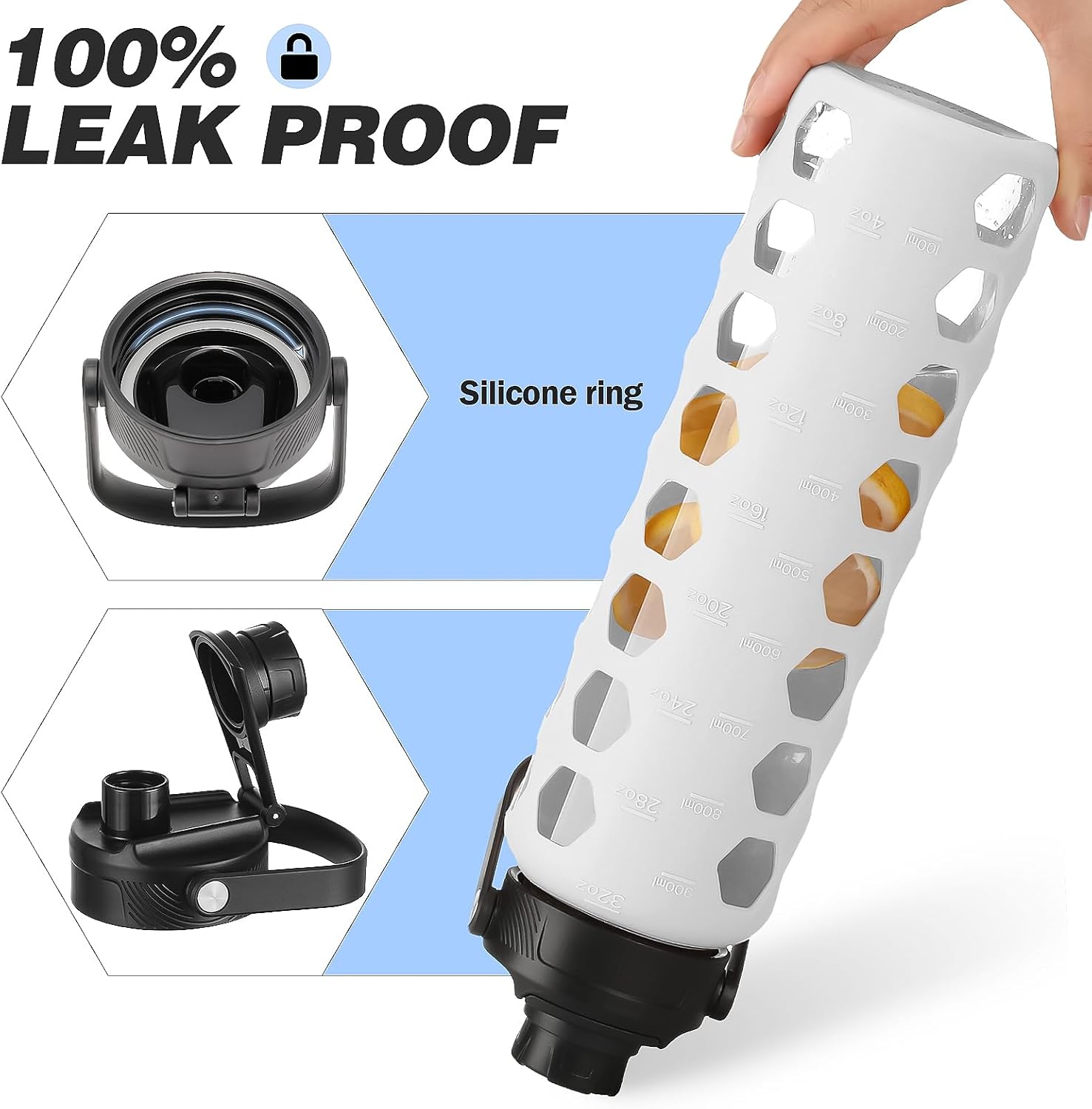 - GLASS WATER BOTTLES WITH TIME MARKER:MUKOKO 32oz glass water bottle with time marker preserves the purity of water.This is a very handy way to keep up with daily water intake,stay hydrated and healthy.
