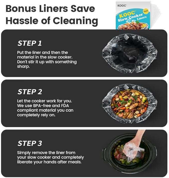 - [Additional Liners] Each KOOC slow cooker comes with 6 additional slow cooker liners that fit snugly inside the crocks for easy cleanup and maintenance