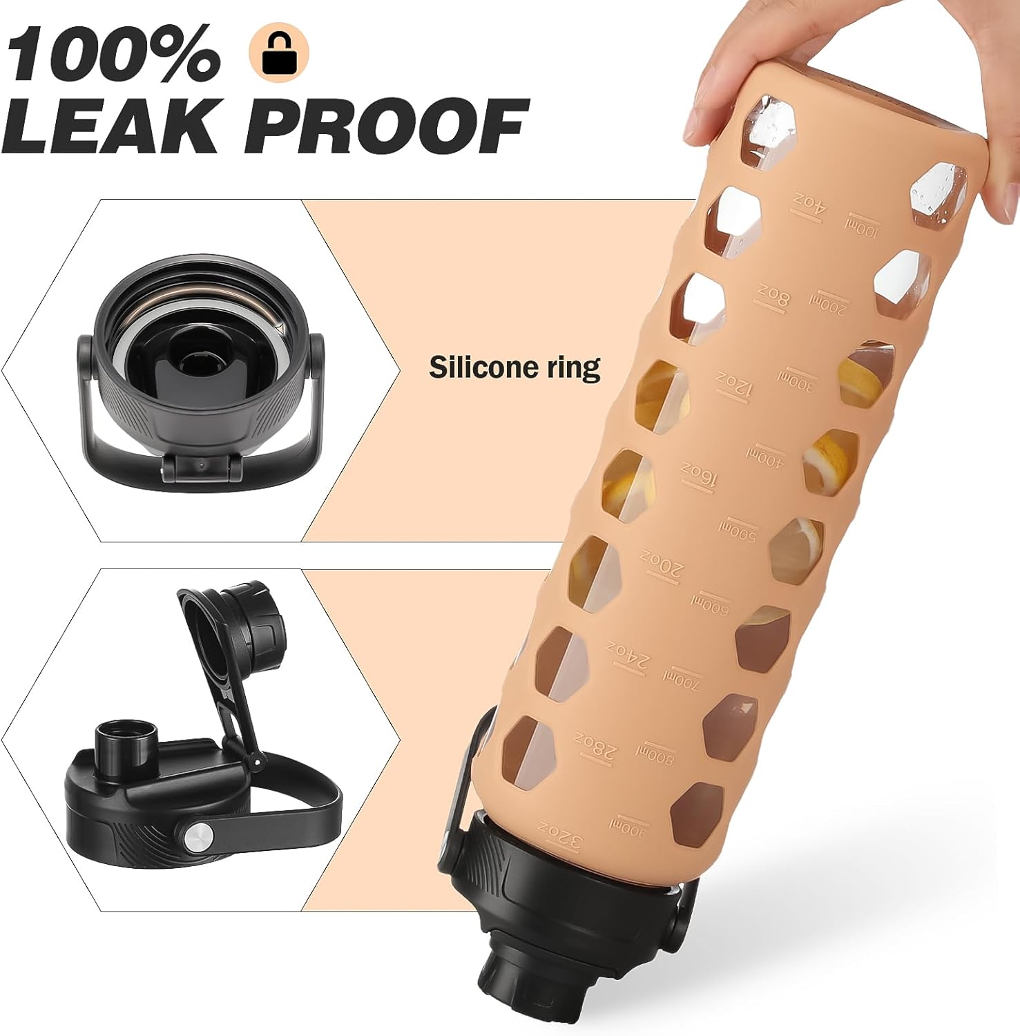 MUKOKO Glass Water Bottles, 32oz Glass Tumbler with Straw, Drinking Bottles with 2 Lids-Handle Spout Lid&Bamboo Straw Lid, Motivational Water Bottle with Time Marker and Silicone Sleeve, 1 Pack-Amber
