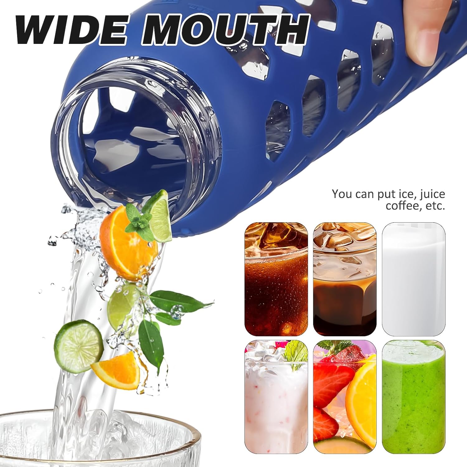 MUKOKO Glass Water Bottles, 24oz Glass Tumbler with Straw, Drinking Bottles with 2 Lids-Handle Spout Lid&Bamboo Straw Lid, Motivational Water Bottle with Time Marker and Silicone Sleeve, 1 Pack-Blue