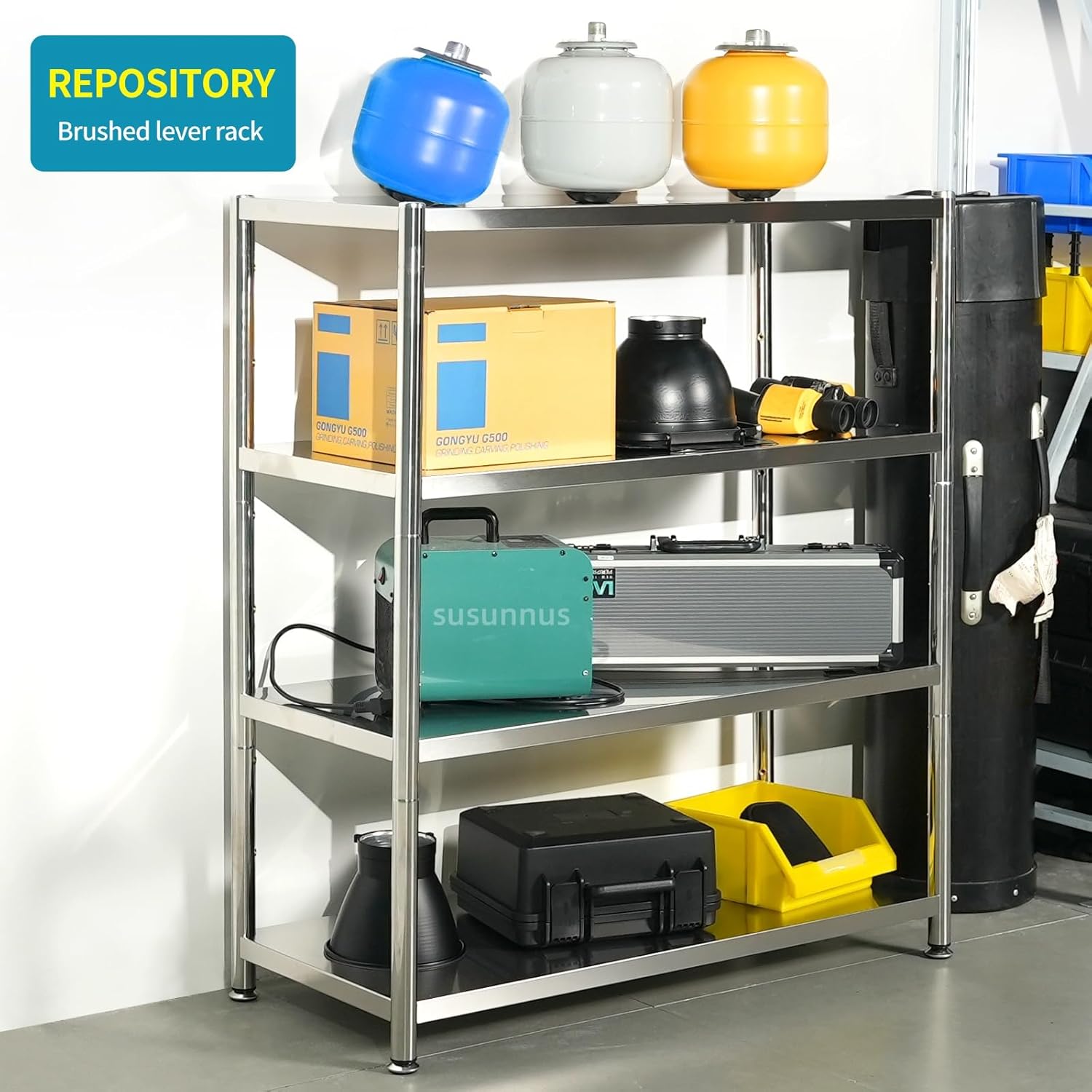 susunnus 4-Tier Stainless Steel Shelf, Heavy Duty Shelving for Kitchen, Garage, Industrial Storage, Kitchen Shelves Adjustable Feet, Easy to Clean(35.8in*15,8in Without Guardrails)