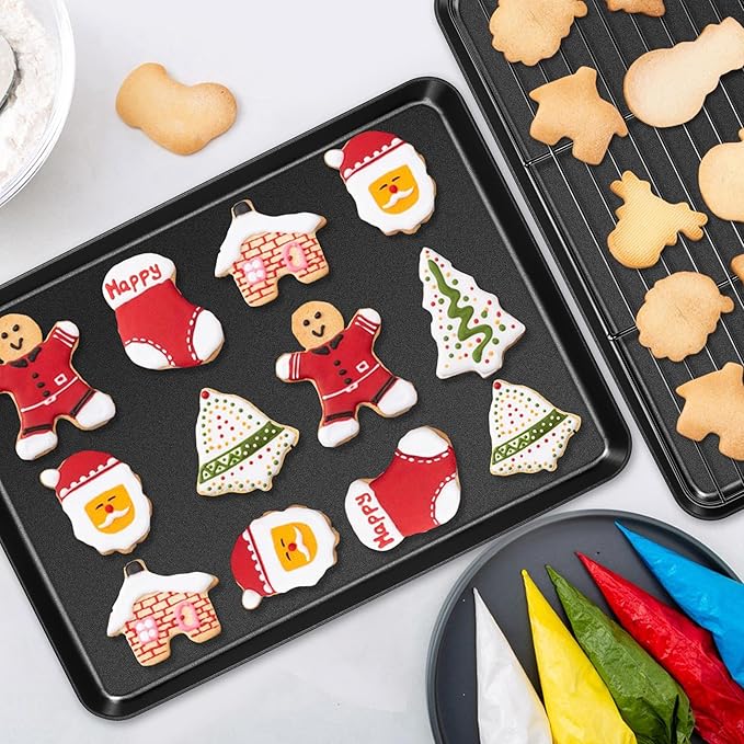 - HEALTHY & STURDY: Toaster oven tray is crafted from heavy-duty carbon steel, Cooling rack is made of pure stainless steel, Both pan and rack are coated with black food-grade non-stick coating, No harmful substance release into your foods, With thick gauge and sturdy construction for using longer time