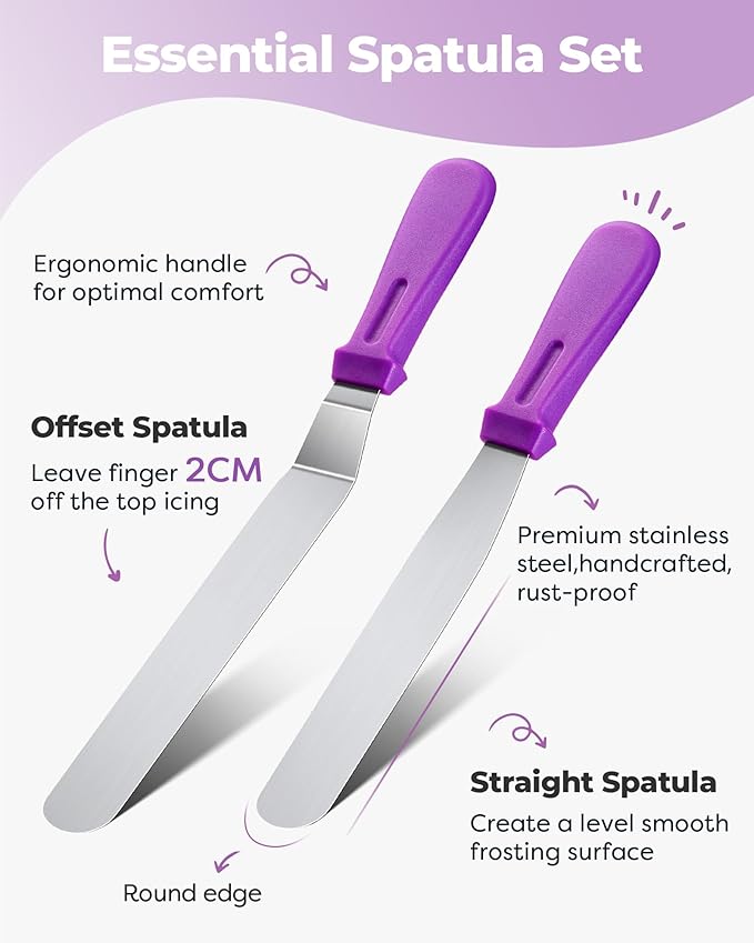 - Straight and Angled Frosting Spatulas: These high-quality stainless steel frosting spatulas make it easy to even out frosting and work on layered cakes. With a 12.5-inch angled spatula and a 10.6-inch straight spatula, you can create even crumb layers and perfect surfaces.