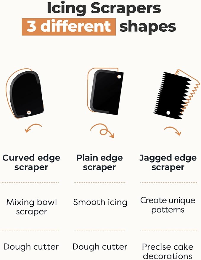 - 3 Edges of Cake Scrapers: This cake decorating set includes 3 different icing comb scrapers, so you can make various designs on your cake. With one rounded scraper, one straight scraper, and one toothed scraper, you can easily create complex and stunning designs.