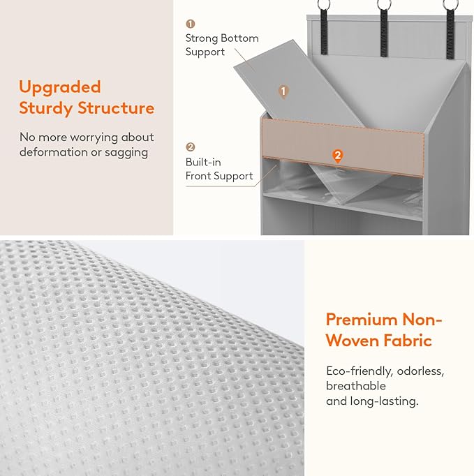 - Premium Material & Sturdy Structure: Lifewit hanging over the door organizer is crafted from high-quality non-woven fabric, making it odorless, breathable, and tear-resistant. The thickened cardboard support insert ensures its sturdy structure and anti-tilt, with a heavy load of 40 lbs(18kg), perfect for long-term use.