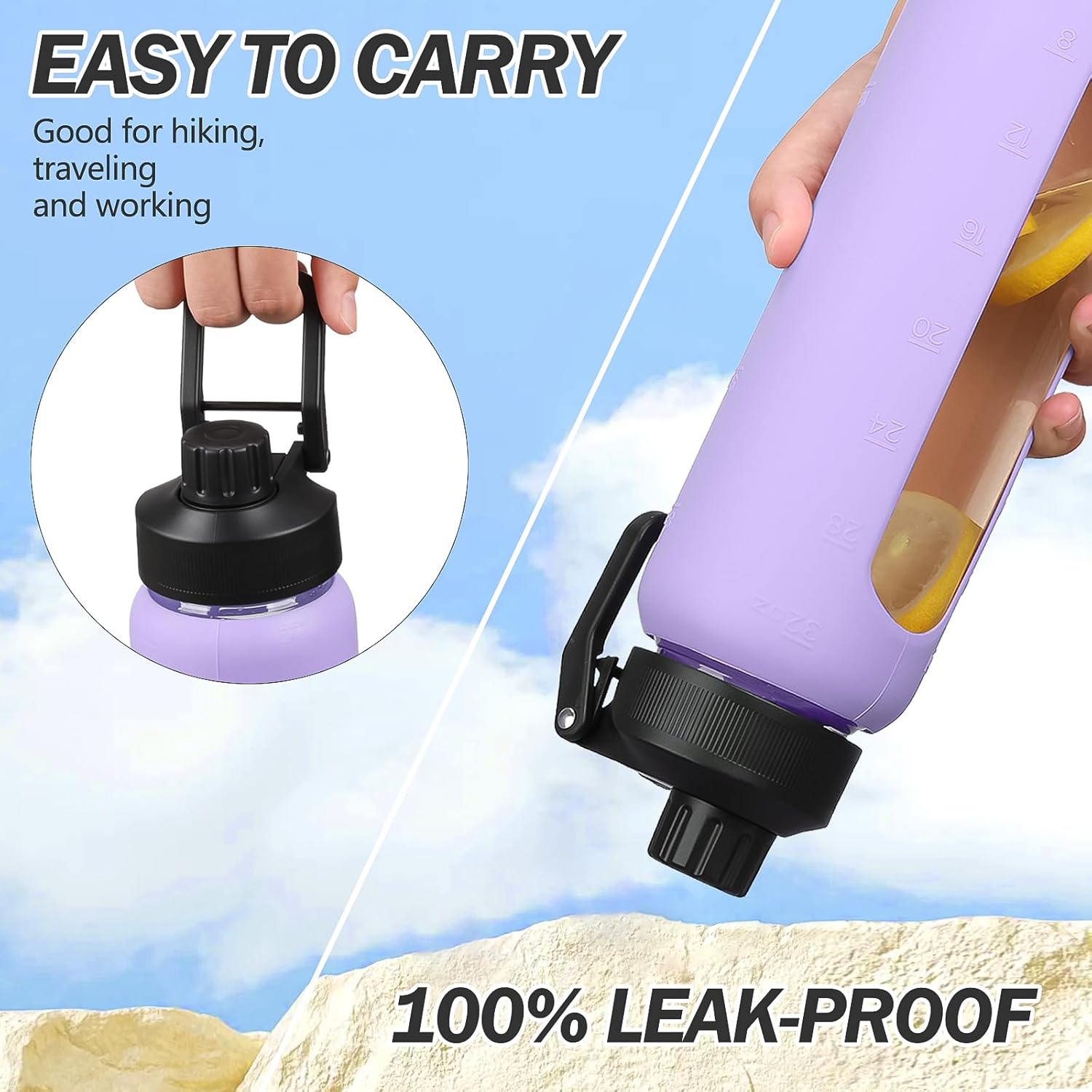 - DURABLE HANDLE & TIME MARKERS- Our premium water bottle with time marker with an ergonomic handle is sturdier than standard designs, ideal for outdoor activities like hiking where it can be securely attached to a backpack. Additionally, our big water bottle features hourly time markers to track daily water intake, supporting your health goals wherever you go.