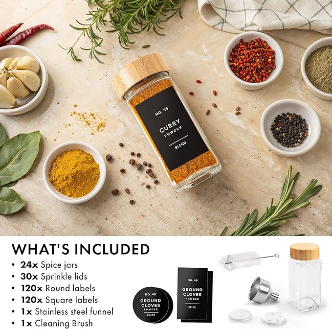- HIGH QUALITY BAMBOO: The set includes 24 square spice jars with round bamboo lids, a stainless steel funnel, 24 spice shakers/dispensers, 240 labels and a cleaning brush - ideal for convenience in your kitchen, storage, and organization.
