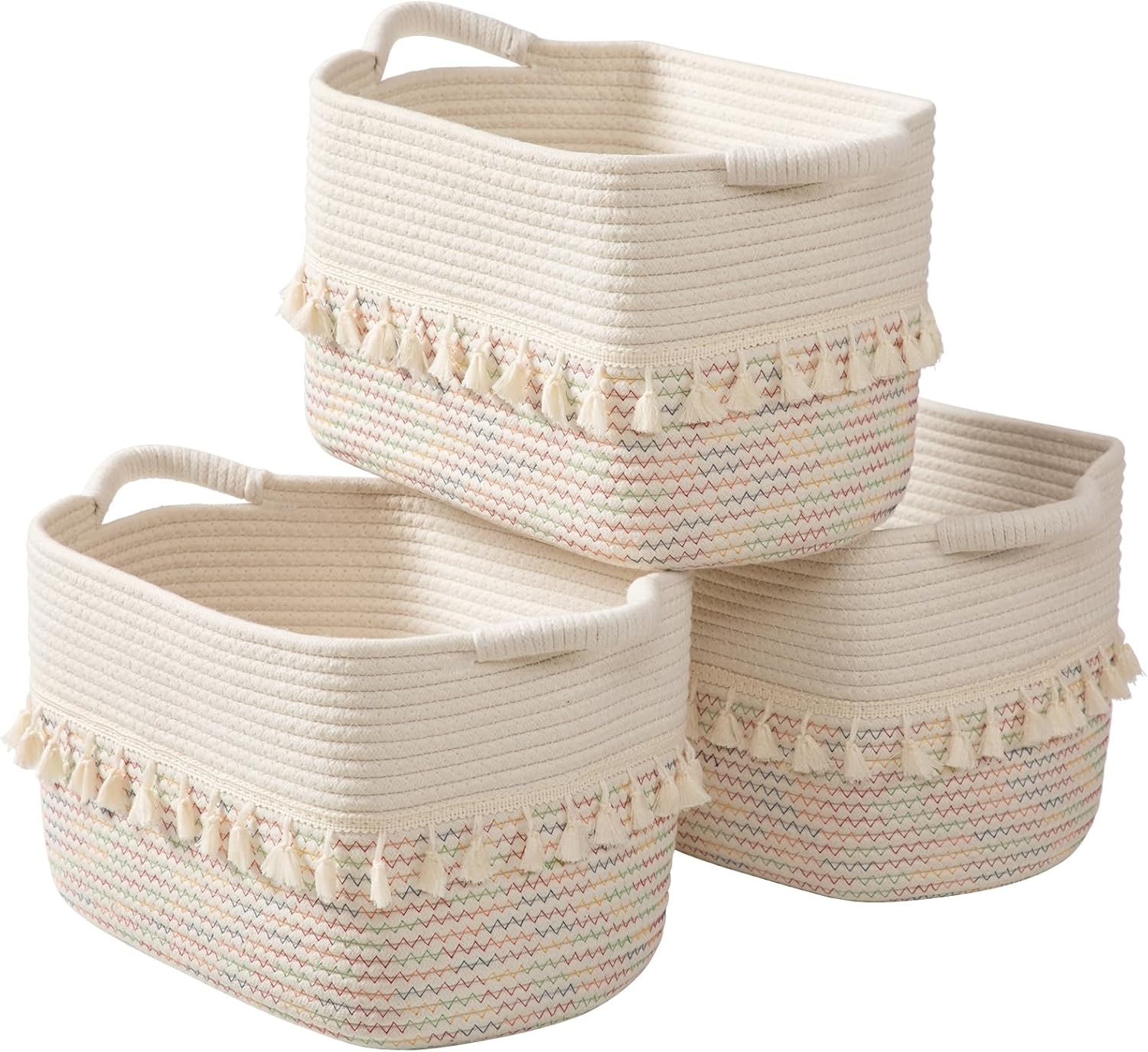TeoKJ Woven Baskets for Storage, Set of 3 Cotton Rope Basket with Handle for Decor and Storage, Cute Baskets for Organizing in Classroom, Kitchen, Bathroom, White & Stitches Rainbow