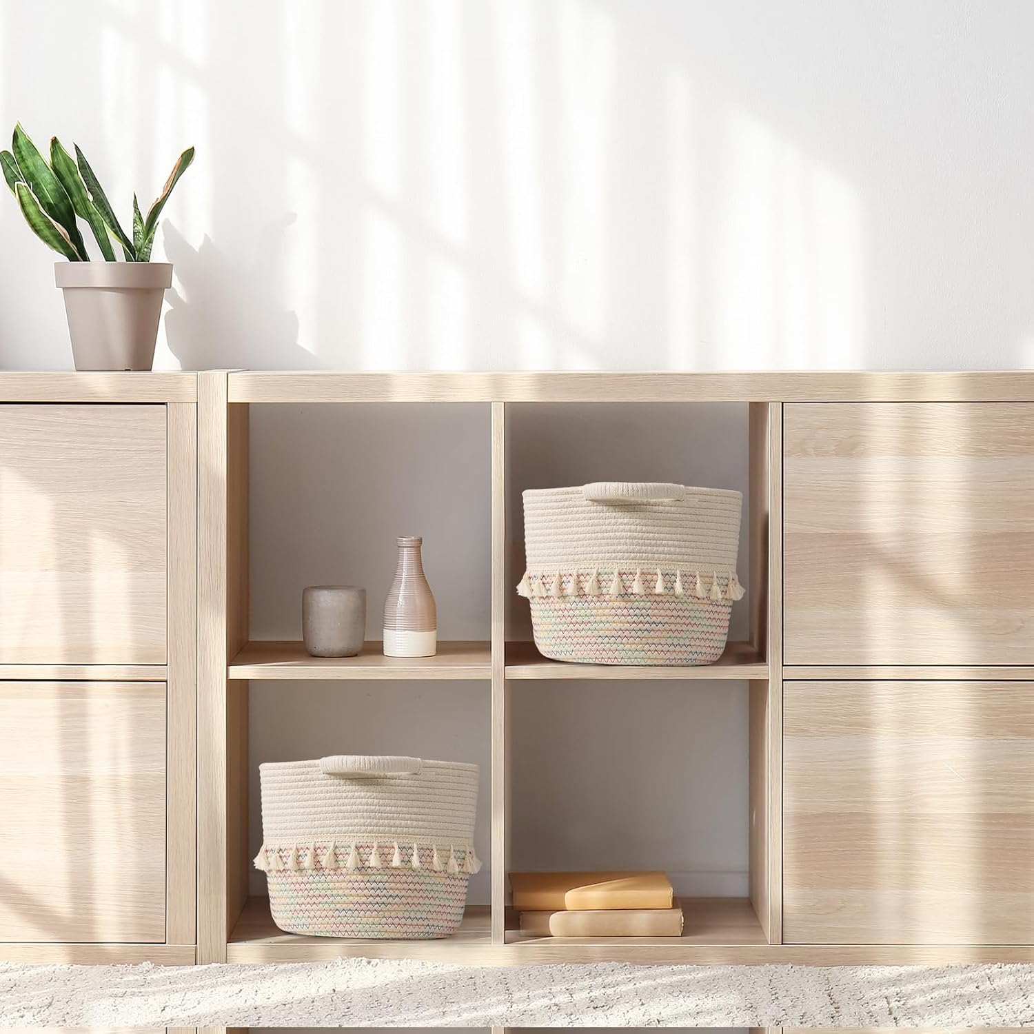 - Solid and durable: Our boho storage baskets feature sturdy handles that make them easy to move around. Rope baskets stand the rigors of daily use. Thanks to a flexible and resilient cotton material, they can bounce back into shape after being folded