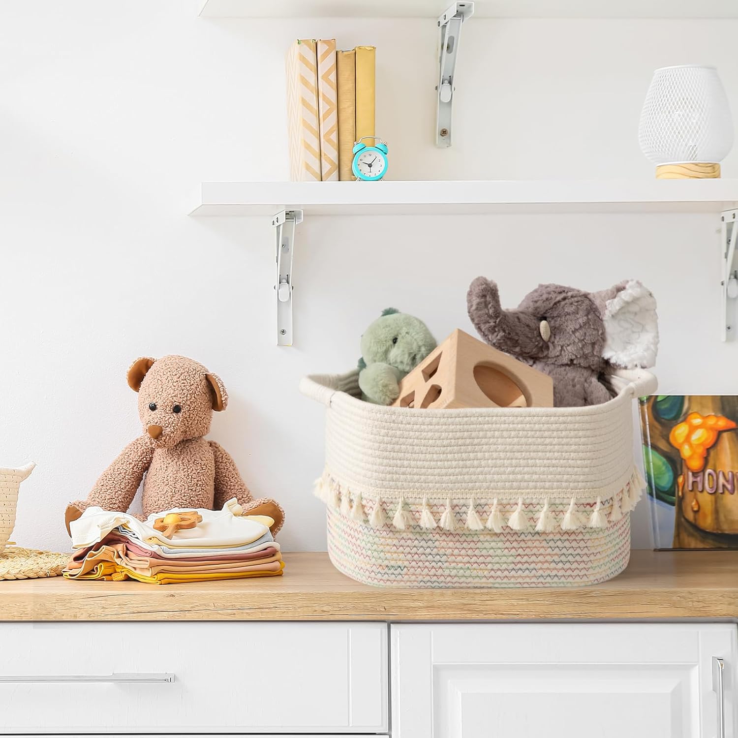 - Seven colors to choose from: These cotton rope storage baskets (15"x10"x9") are available in seven different colors: Jute, white, White&Jute, White&Gray, White&Pink, Stitches Rainbow and Black&Jute. So you can choose the color that best fits your decor