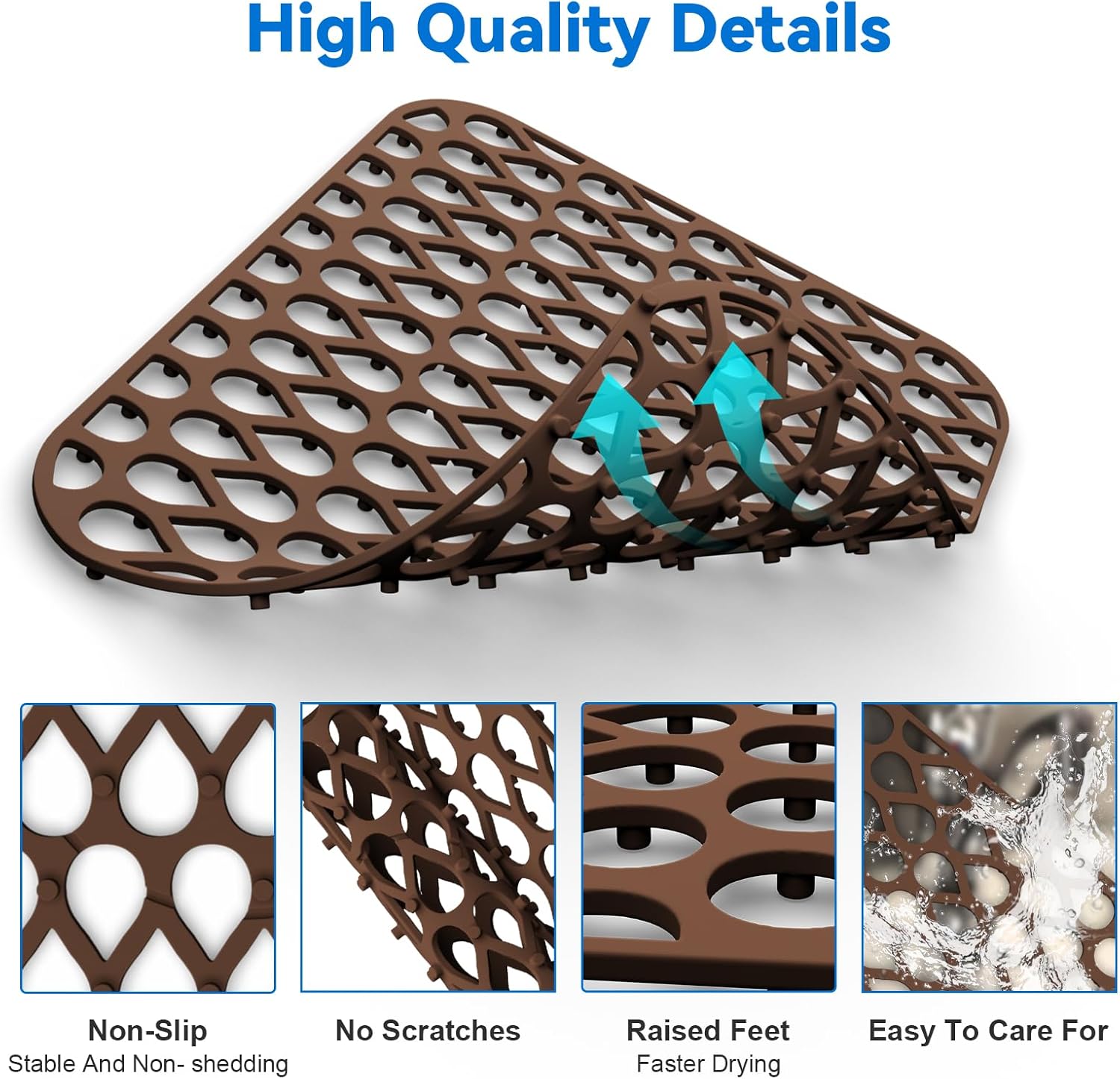 - 【Silicone Material】 Silicone Unlike metal sink mats, silicone sink protectors are super non-slip, preventing spoons and other silverware from scratching the sink, silicone sink mats prevent dishes from slipping down the drain, protecting your sink from clogging, silicone sink mats are suitable for most drain openings.