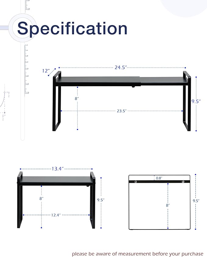 - EXPANDABLE: You may expand the width of this freestanding cabinet shelf to your desires. It can easily vary from 13.4 inches to 24.5 inches in width depending on how you want to organize your space. Specification: 12’’D * 13.4-24.5’’W * 9.5’’H