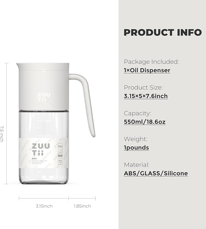 - Easy Cleaning and Filling: The wide mouth design of the Zuutii Oil Dispenser makes it incredibly easy to clean and refill. You can quickly and effortlessly fill the bottle with your favorite oils or other condiments, and cleaning is a breeze, whether you hand wash or use the dishwasher.