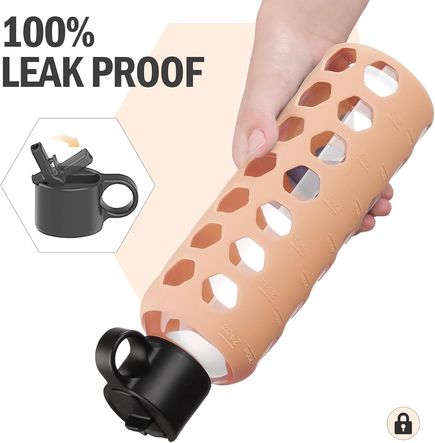 MUKOKO Glass Water Bottles, 24oz Glass Tumbler, Drinking Bottles with 2 Lids-Handle Flip Straw Lid&Bamboo Lid, Motivational Water Bottle with Time Marker and Silicone Sleeve, Leakproof-1 Pack-Amber