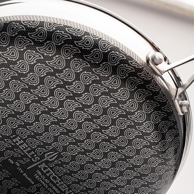 - TRI-CLAD STAINLESS for Quick & Even Heating: Hell’s Kitchen Hybrid Tri-Clad cookware features stainless steel construction with a conductive aluminum core, and a laser-etched flame pattern above a durable nonstick surface.
