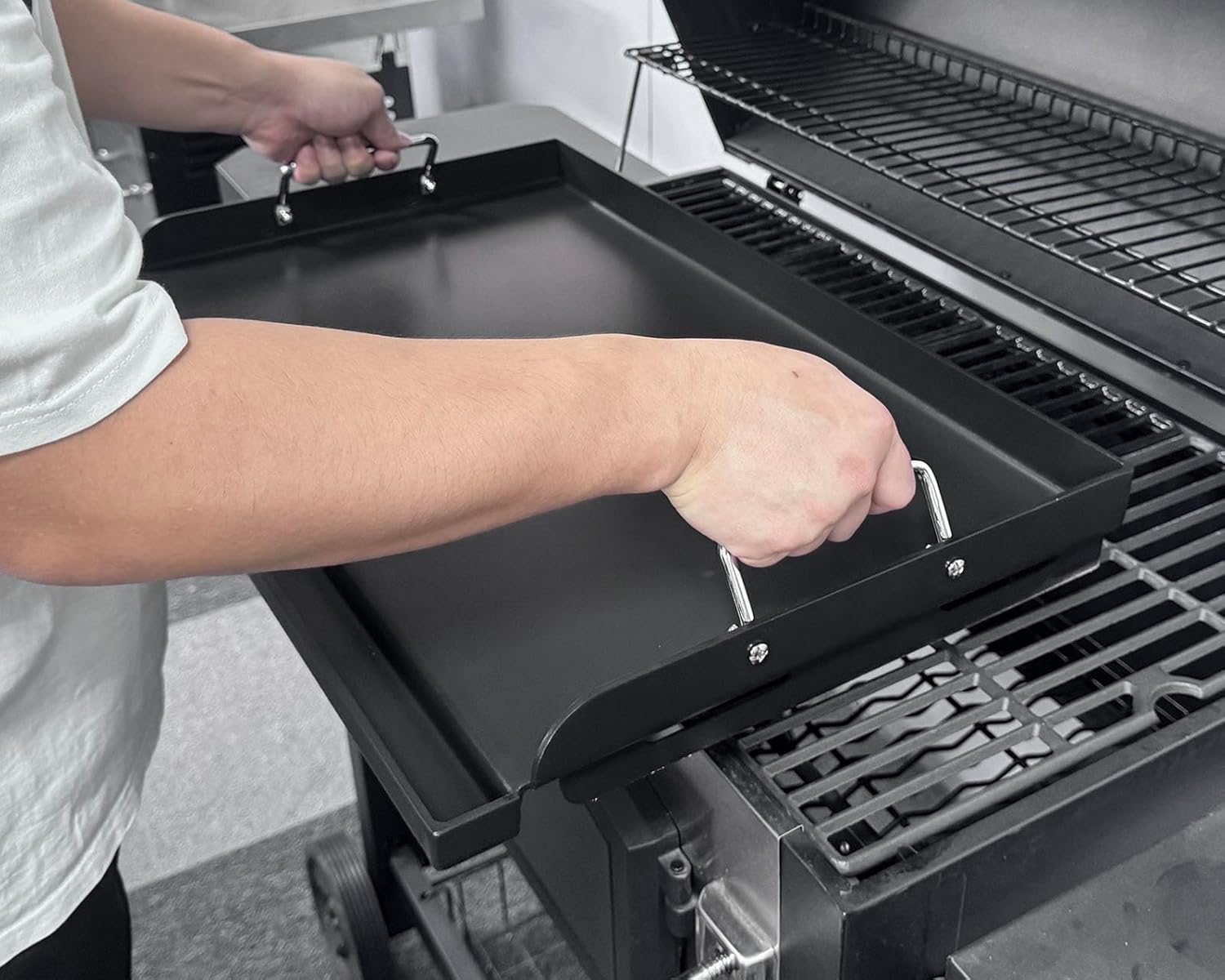- 【From Grill to Griddle】Enjoy the best of both worlds by transforming your Grates into a griddle, in a matter of seconds. Simply remove your cooking grates and replace them with griddle to create food never thought possible in a grill, such as pancakes, eggs, pasta, fajitas and more.