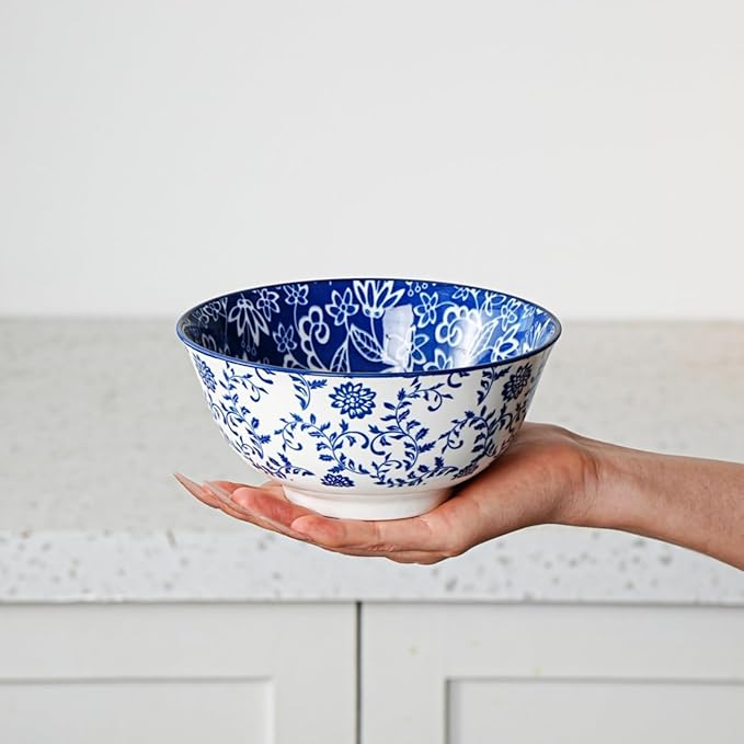 - TIMELESS ELEGANCE: Each of these unique ceramic bowl sets in blue and white, inspired by Chinese aesthetics, is a one-of-a-kind masterpiece. They are adorned with beautifully mismatched patterns and coated with a layer of transparent, food-safe glazes. This not only ensures exceptional scratch and fade resistance but also makes them easy to clean. A quick wash with soap or a cycle in the dishwasher effortlessly restores their original shine.