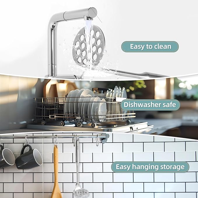 - COMFORTABLE HANDLE; Ergonomically designed for a comfortable grip, allowing effortless operation. The masher tool handle includes a hanging hole at the end for convenient storage.