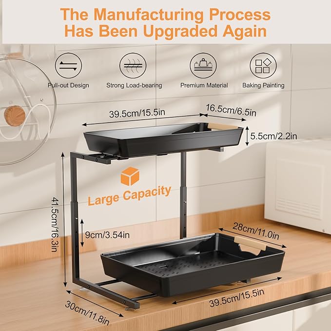 - 【Stable and Sturdy】The whole construction of the under sink organizer is made from selected stainless steel metal material to ensure durability and reliability. The support tube is reinforced and forged to bear a maximum load of 76.8LB, and the painting process makes it waterproof and rust-proof, allowing it to be used for a longer time in a humid environment.