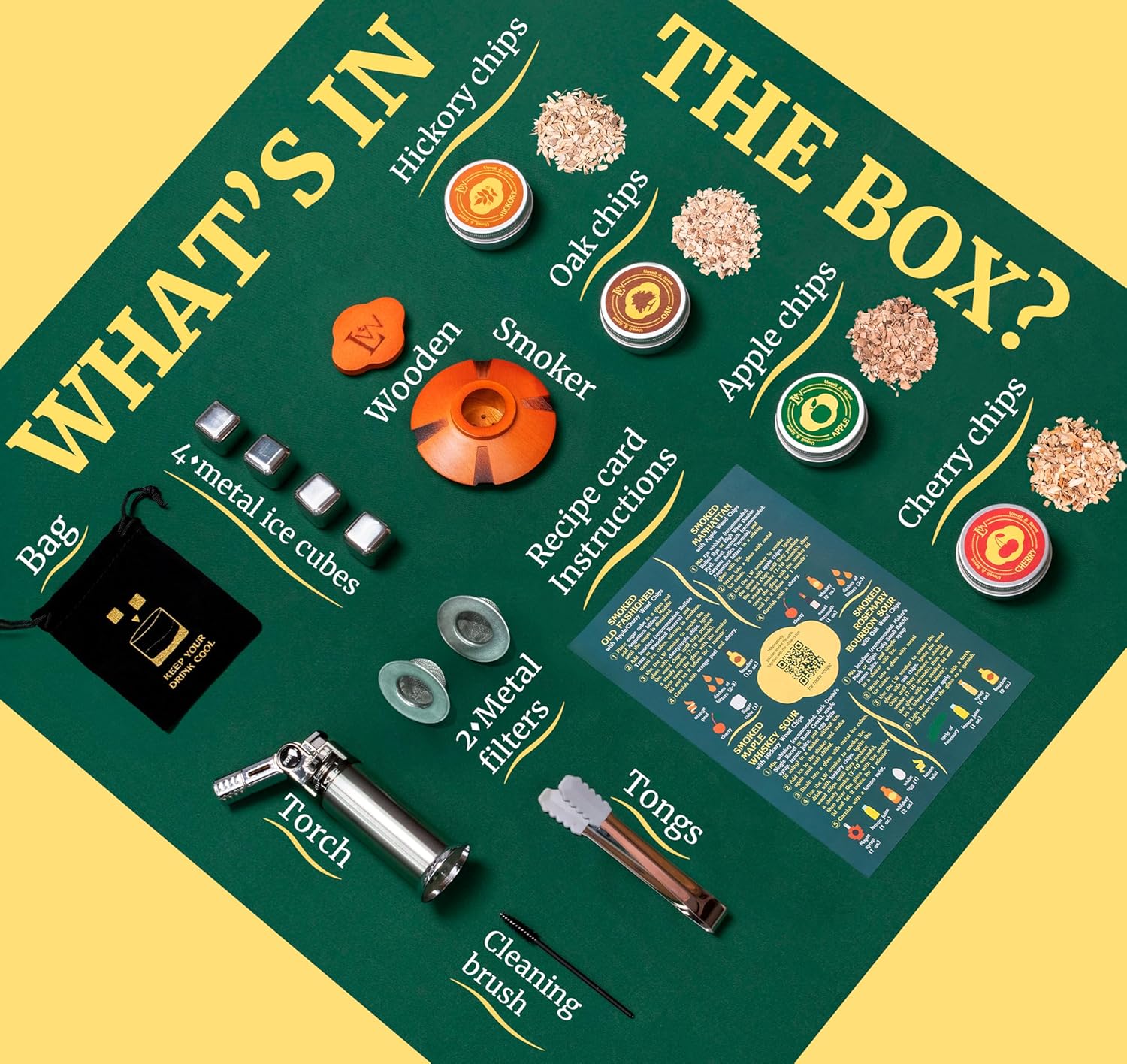 - Included Components : Wooden Smoker, Torch (butane not included), Four Flavors of Wood Chips, Four Stainless Steel Cubes, Two Stainless Steel Mesh Filters, Tongs Cleaning Brush Wooden Smoker, Torch (butane not included), Four Flavors of Wood Chips, Four Stainless Steel Cubes, Two Stainless Steel Mesh Filters, Tongs Cleaning Brush