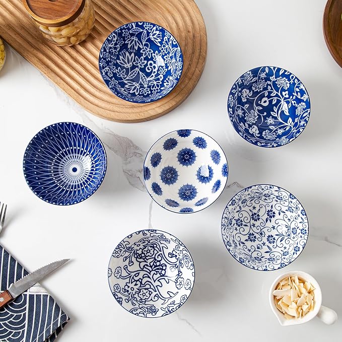 - TIMELESS ELEGANCE: Each of these unique ceramic bowl sets in blue and white, inspired by Chinese aesthetics, is a one-of-a-kind masterpiece. They are adorned with beautifully mismatched patterns and coated with a layer of transparent, food-safe glazes. This not only ensures exceptional scratch and fade resistance but also makes them easy to clean.