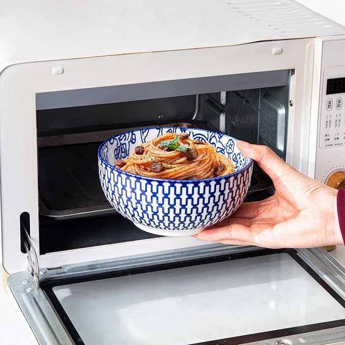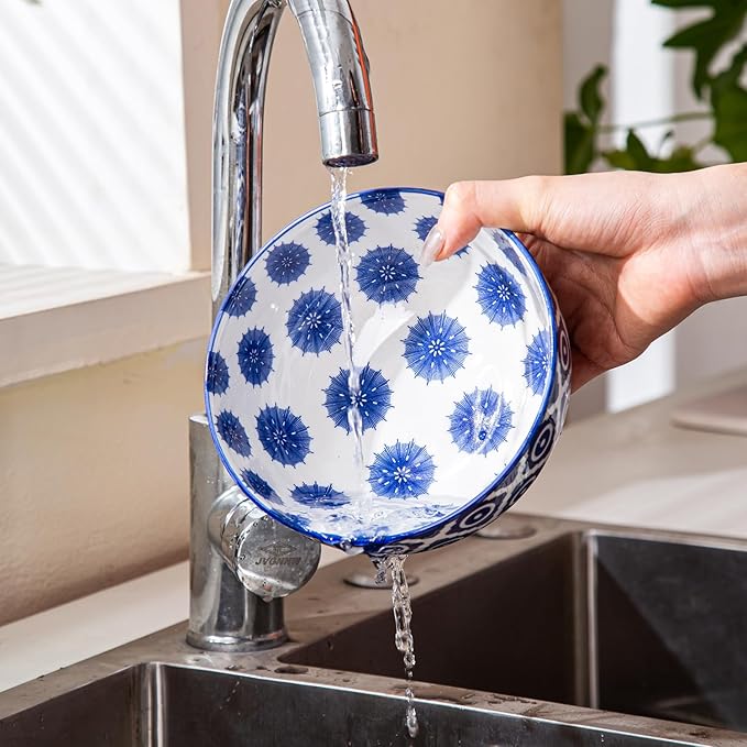 - TIMELESS ELEGANCE: Each of these unique ceramic bowl sets in blue and white, inspired by Chinese aesthetics, is a one-of-a-kind masterpiece. They are adorned with beautifully mismatched patterns and coated with a layer of transparent, food-safe glazes. This not only ensures exceptional scratch and fade resistance but also makes them easy to clean.