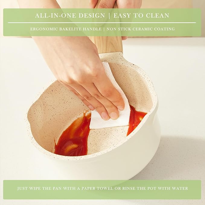 - The cookware set is ergonomically designed ergonomic bakelite handle and is comfortable to grip & easy to lift and pour. All-in-one design. Rivetless interior to prevent food from sticking. Just wipe the pan with a paper towel or rinse the pot with water, which makes cooking not only easier but also more enjoyable.