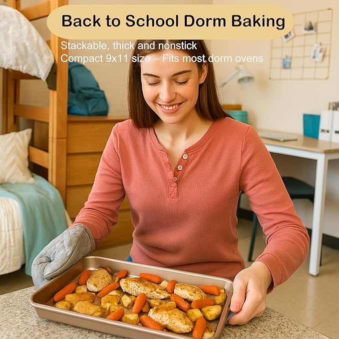 - Superior Nonstick Coating: The gold-colored nonstick coating of small cookie sheet ensures effortless food release and easy cleanup, easy hand wash and place in dry place, easy maintenance even baking at school dorm or using for summer grilling tray