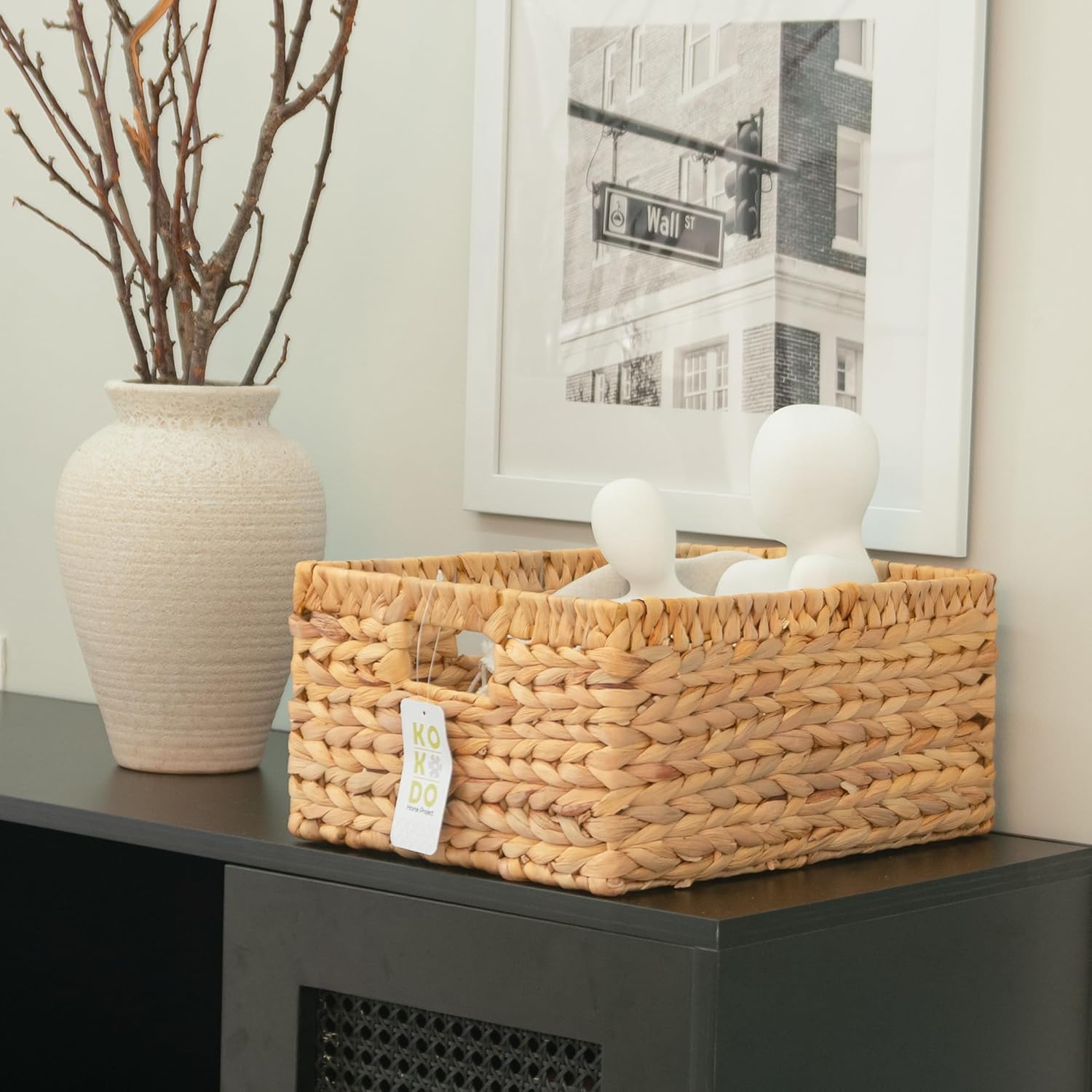 KOKODO 15"Lx11"W Large Rectangular Water Hyacinth Wicker Storage Baskets with Handles and Metal Frame, Stylish and Durable Handwoven Bin for Space-saving Room Organizing or Decorative Wicker Basket