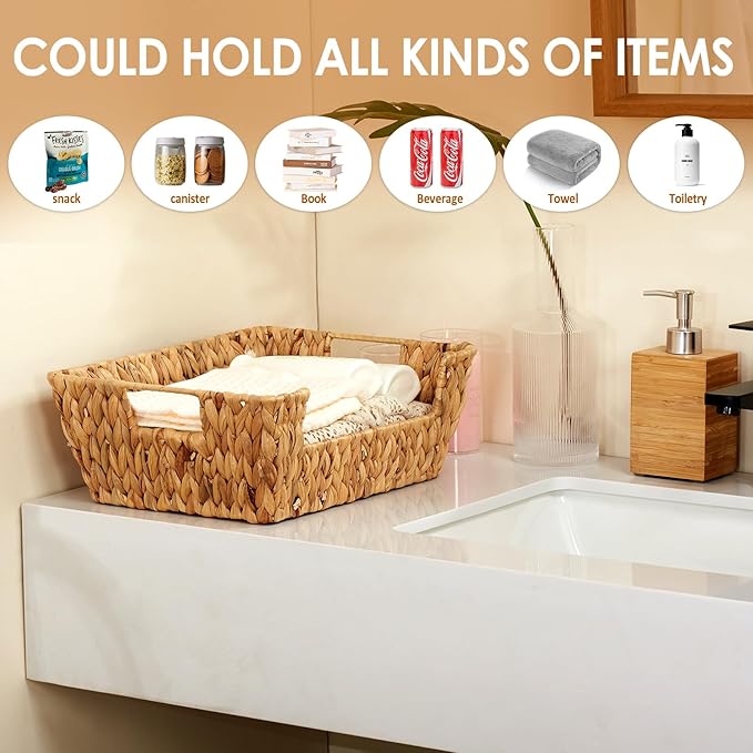 - [NATURAL WATER HYACINTH WICKER BASKETS] The wicker baskets for organizing are made of 100% natural water hyacinth, safe for daily use.