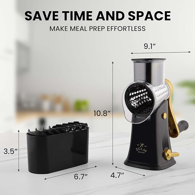 Zulay Kitchen Rotary Cheese Grater 5 Blade Cheese Shredder - Manual Hand Crank Cheese Grater With Reinforced Suction & 5 Interchangeable Drums - Easy to Use, Vegetable Chopper Round Mandoline Slicer