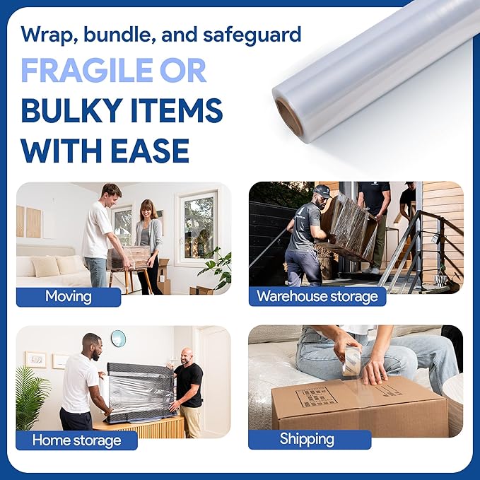 - EFFORTLESS PACKING & STORAGE: Ditch the messy tapes and frustrating twine! This stretch film conveniently wraps furniture, boxes, and more, leaving no residue behind. Perfect for space-saving storage too!