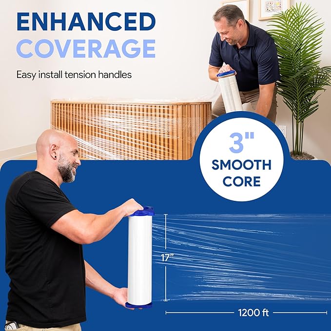 - CONQUER MOVING DAY: Wrap, bundle, and secure all your belongings with ease using this 17" x 1200 ft stretch film with tension handles. Move with confidence knowing your items are protected!