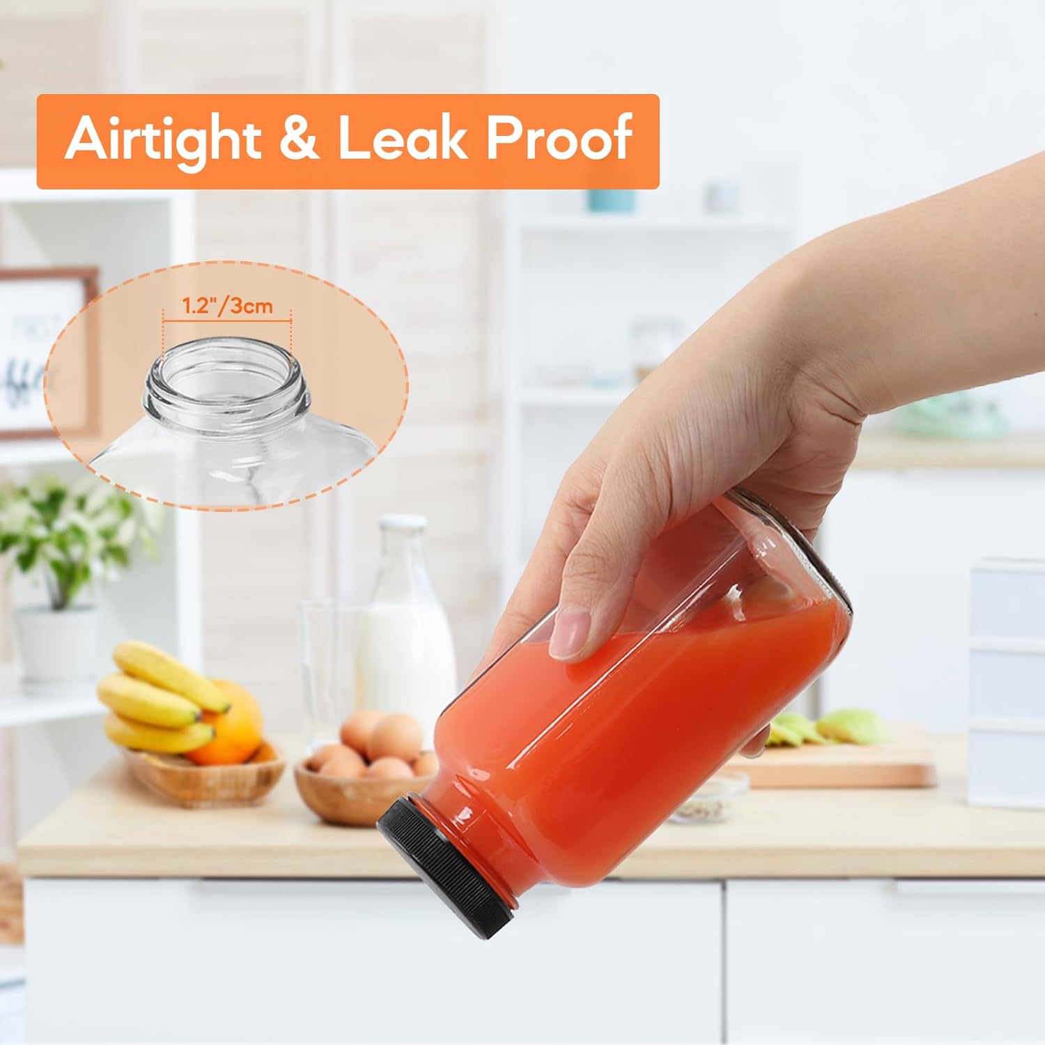 STARSIDE 8 oz Glass Juice Bottles with Lids 6 Pack - Square Reusable Drinking Jars for Juicing, Milk, Kombucha - Includes 1 Bottle Brush, 6 Colored Labels