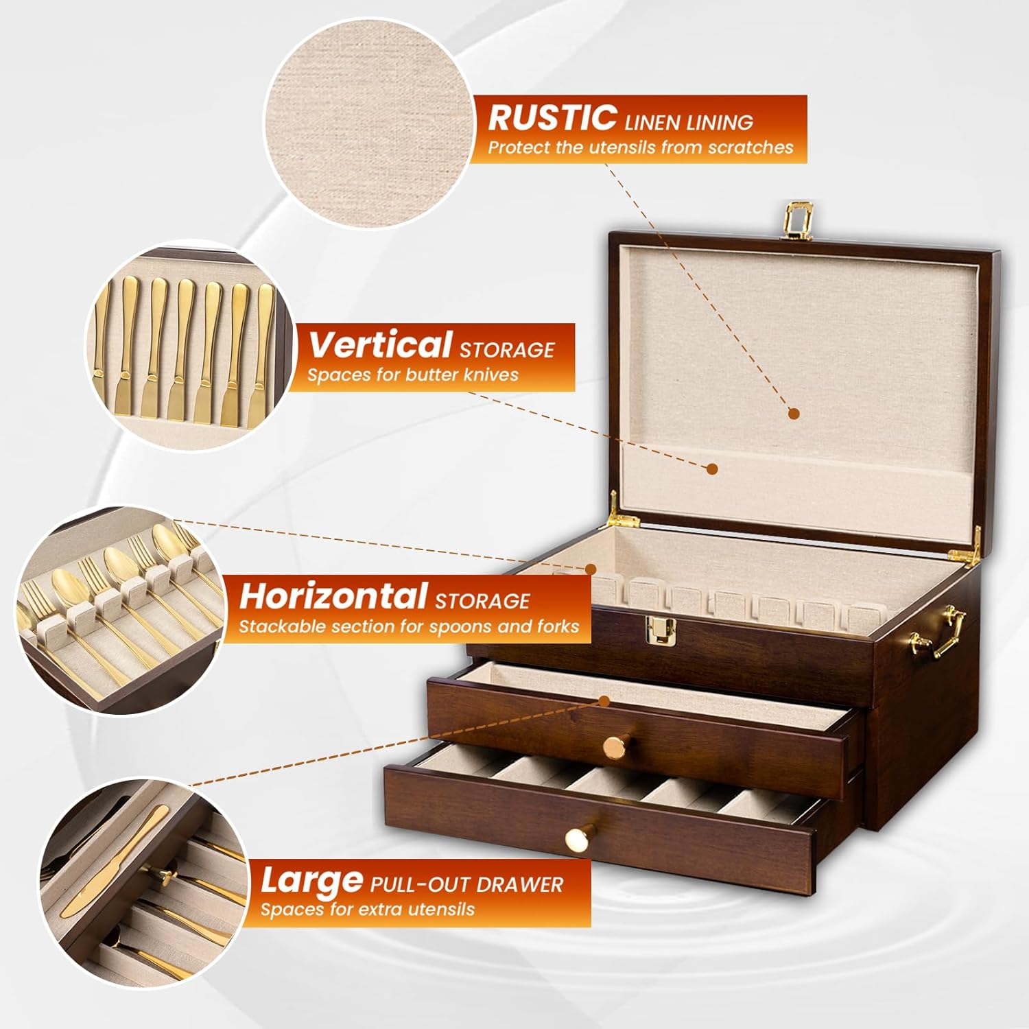 - Authentic Wood Craftsmanship: Crafted from solid wood in a rustic country style, this sturdy and durable silverware chest exudes a sense of luxury. The silverware boxes for flatware features the linen lining to effectively prevent scratching or damage to your silverware, ensuring they're intact for years to come.