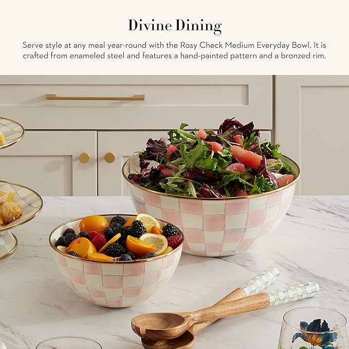 MACKENZIE-CHILDS Enamel Everyday Bowl, Serving Bowl for Entertaining, Medium, Pink-and-White Rosy Check, Set of 1