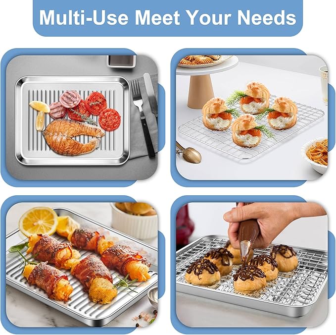 - Oven & Dishwasher Safe: The small baking pan with rack set is oven safe, baking rack can fit in the baking tray, Smooth mirror finished for less sticking and easily releasing, Dishwasher safe to save your hassle, Effortlessly clean up even in hand-wash, Allowing you to enjoy your easy baking time