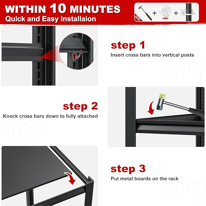 - 【Easy Assemble Garage Shelving】Our shelving unit are easy to assemble without any nuts or screws, due to their interlocking design. To ensure quick setup, we include a rubber mallet, gloves, and clear instructions—enabling you to assemble it within 10 minutes. This efficient process saves significant time
