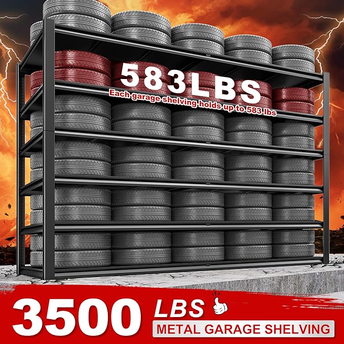 - 【3500LBS Capacity Heavy Duty Shelving】Our garage shelving is made of high-quality steel material, and double-layer thickened rack. Unlike fragile wooden boards, our storage shelves is durable and solid, with strong ribs under each steel board with a capacity of 583LBS. The metal shelving is not only more sturdy and durable than ordinary ones, but also has a total capacity of 3500LBS to provide excellent support