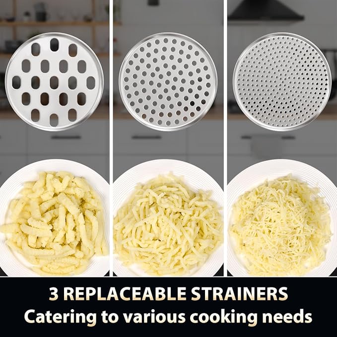 - 3 Interchangeable Discs:Expand your ricer's capabilities with our set of 3 peeling discs included in the purchase. This versatile ricer isn't limited to potatoes. You can also use it with soft carrots, avocados, pumpkins, yams and so on