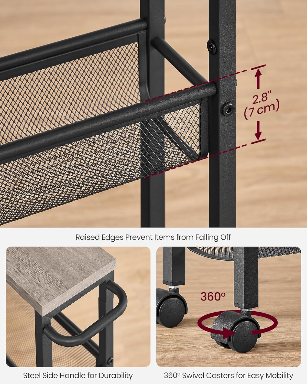 VASAGLE Slim Rolling Cart, 4-Tier Storage Cart, Narrow Cart with Handle, 5.1 Inches Deep, Metal Frame, for Kitchen, Dining Room, Living Room, Home Office, Heather Greige and Classic Black ULRC032K01