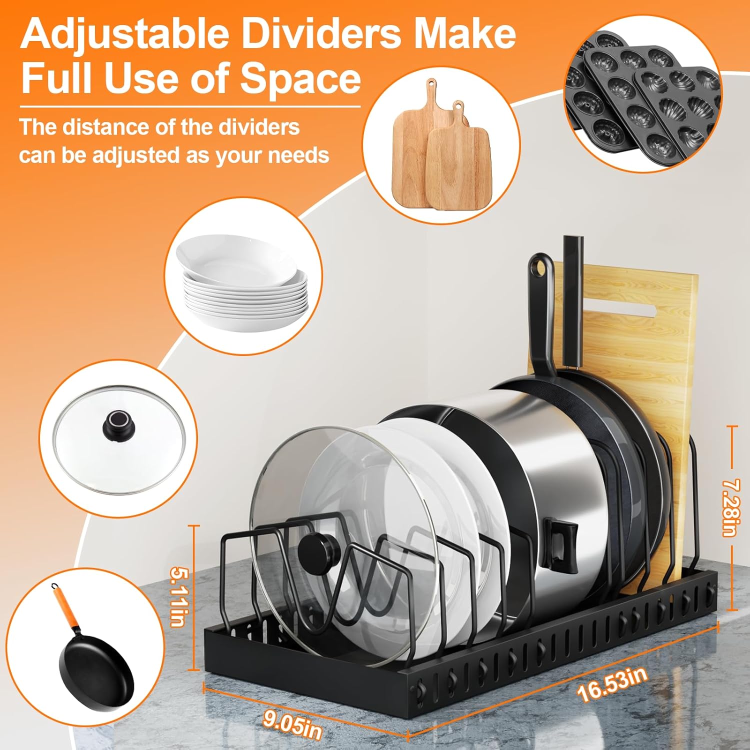 - 【Adjustable Shelf Design】The lid organizers inside cabinet has two types of adjustable shelves that can be customized according to the shape of the kitchen utensils to meet your various needs.
