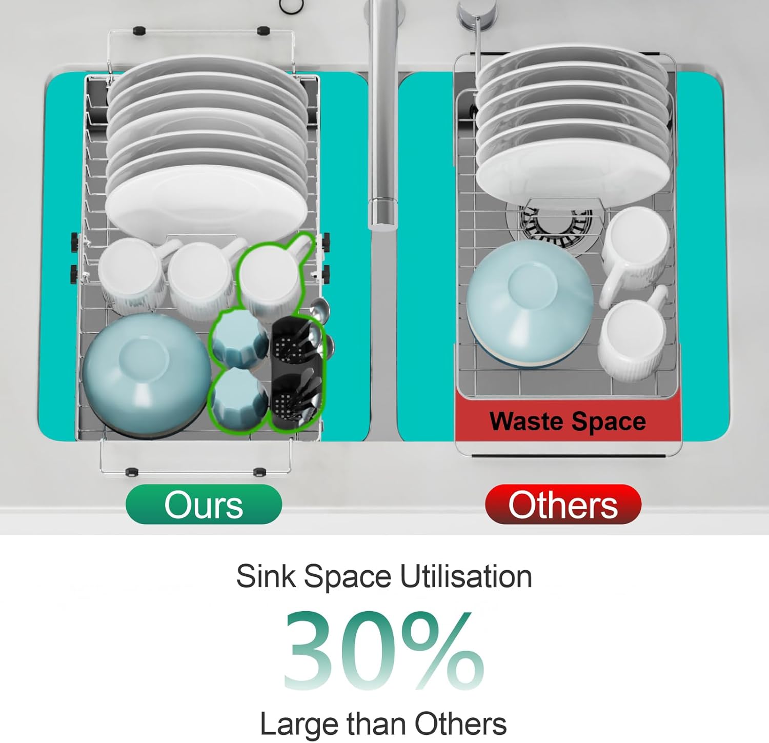 - True Expandable, Real Capacity Boost: Unlike other racks that only extend handles, our dish drainer expands as a whole unit—truly increasing your drying space, allowing you to comfortably hold at least 3 extra cups in addition to 7 plates, bowls, utensils, and even fresh fruits and veggies. This innovative design not only ensures perfect sink compatibility but genuinely maximizes your drying area