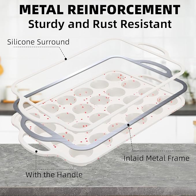 - Metal Structure Silicone Muffin Pan: The hidden stainless steel frame around the outer edge makes silicone muffin pan more sturdy. No more spilling after batter fill in with when transfer silicone mini muffin pan from counter to oven