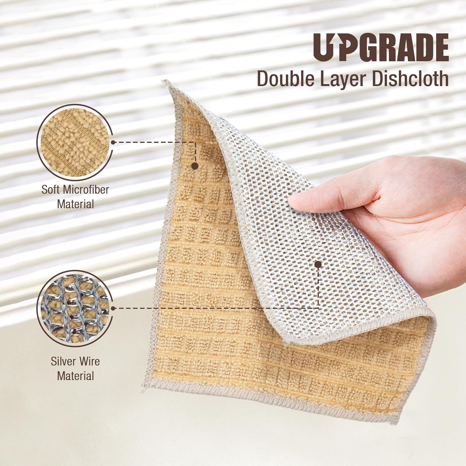 - New upgrade Double Layer Dishcloth. Front side is super soft and absorbent microfiber material which is great for cleaning any delicate surfaces and quickly dry any moisture and water; Back side is non-scratch silver wire material which can easily remove stubborn stains and will not leave any scratches on the surface.