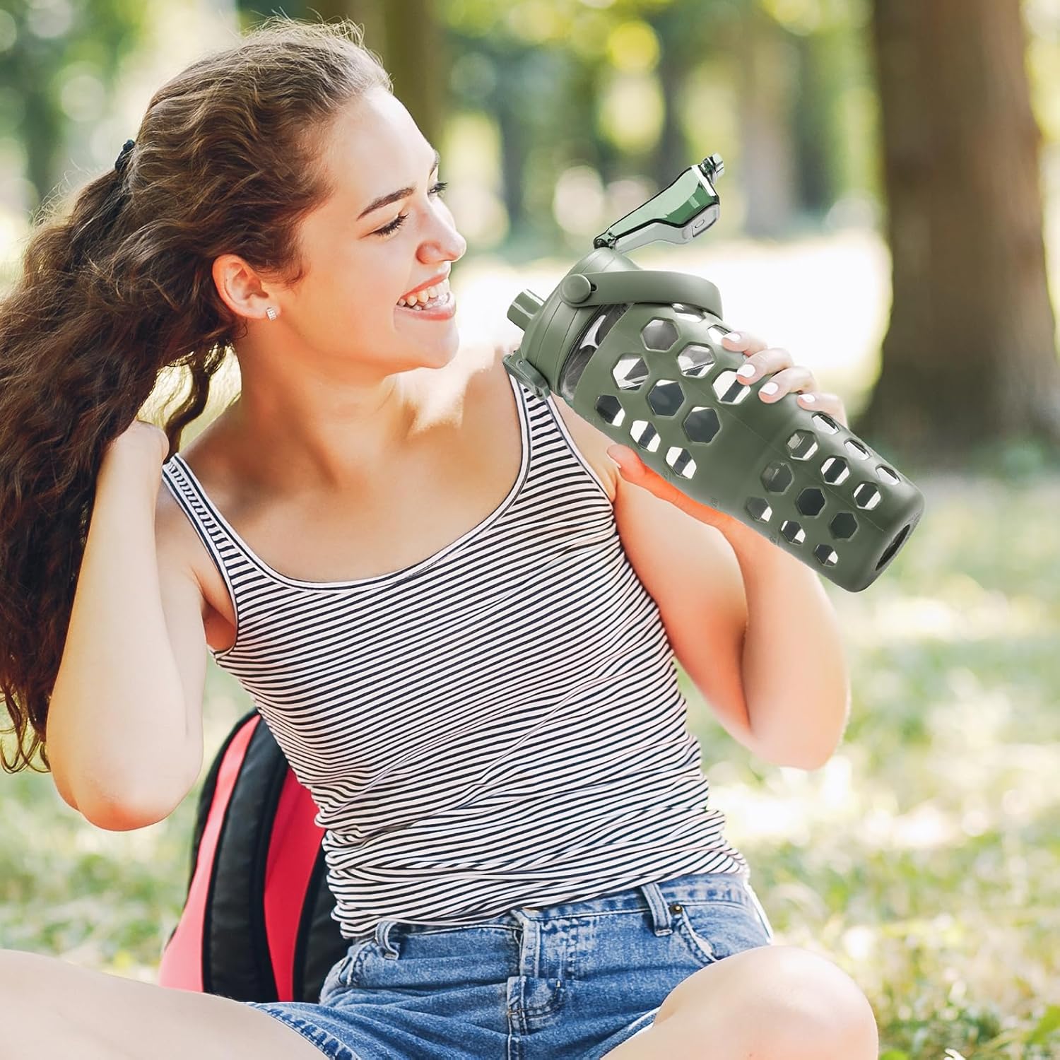 MUKOKO 32 oz Glass Tumbler with Straw,Glass Water Bottles with Time Marker,Iced Coffee Cup with 2 Lids-Handle Spout Lid&Straw Lid,Silicone Sleeve,Leakproof,1 Pack-Olive